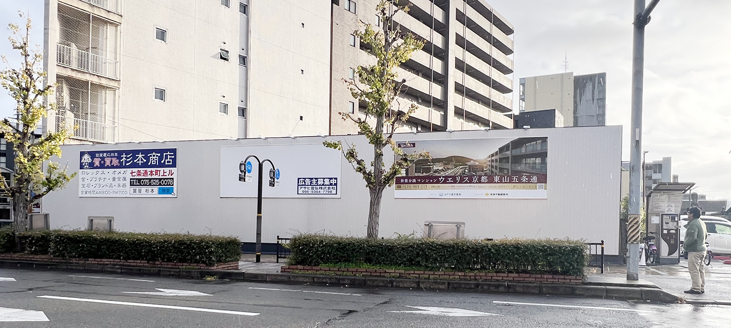 創業70余年で培ったノウハウでお客様のニーズにお応えする力。 アサヒ宣伝は、屋外広告に携わって70余年。 これまで、さまざまなクライアント様からご愛顧を賜りました。 そして時代は移り、屋外広告もOOH (Out of Home)と呼ばれる今では、その手法も店先の従来の看板から、配信でコントロールができるデジタルサイネージまで、多種多様に渡ります。 弊社でも、今後のお客さまのニーズにお応えするべく、さまざまなタイプの 屋外広告を取り扱っております。お気軽にお問い合わせください。 南禅寺畔 八千代 老舗旅館晴鴨楼 屋外デジタルサイネージ 近年では、交差点ではデジタルサイネージを見かけるようになりました。京都では景観条例や厳しい意匠審査があり、まだまだ数が少ない印象ですが、弊社では屋外看板のデジタルサイネージ化に力を注いでいます。 ロードサイン等の大きな看板も、デジタルサイネージにすることで、この先に軒を連ねるお店の営業情報や混雑具合を表示できます。また駐車場等で利用すればリアルタイムで空き状況がわかるため、デジタルサイネージの利便性が発揮されます。 屋外広告 (物件)河原町五条交差点 「河原町五条」の交差点南西に位置するこの看板は、京都の主要幹線である国道1号線の五条通に面する本覚寺北側に建てられた看板広告スペースです。京阪電鉄「清水五条」駅からの人通りも多く、立地の良さから道行く人々の注目を浴びます。また、京都有数の繁華街・四条河原町から河原町通を下る車やバスの車窓から見えるこの看板は、国道1号線と丁度交差する見晴らしの良い位置にあり、1枚あたり10㎡と一際強い存在感を放ちながら、行き交う人々の視線を集め訴求効果が期待できます。 詳細はこちら(PDF) この物件への掲出希望やご質問・ご相談は、下記ボタンよりお問い合わせフォームにてお気軽にお問い合わせください。 お問い合わせはこちら
